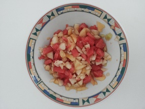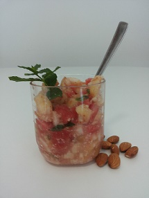Il segreto della macedonia consiste nel tagliare prima i frutti più duri e poi i più fragili. I pezzetti devono essere piccoli, lo so, ci vuole pazienza.. Tritare le mandorle. Unire il tutto e lasciare nel frigo per almeno due ore.