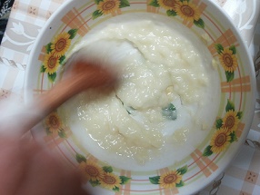 Versare a pioggia la farina in acqua salata in fase di ebollizione, girare sempre verso la stessa direzione. Capirne la giusta consistenza col cucchiaio