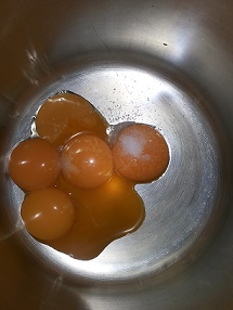 5 uova + 1 di decorazione (separare i tuorli e montarli con un cucchiaino di sale e gli albumi con 5 cucchiai di zucchero);
