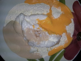Creare la montagna con la farina, burro sciolto, tuorli, albumi, il composto di lievito, essenza di rum e latte.