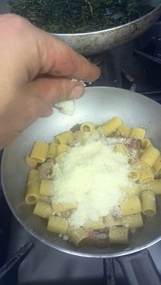 Una volta cotta la pasta, mantecarla nella salsa bollente del guanciale. Poi unire sale, pepe e pecorino.