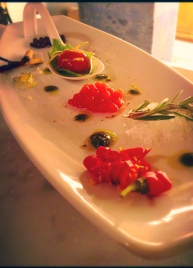 Sul piatto, ci sono tutti gli ingredienti e del “caviale”, termine che si usa quando si vanno a creare delle sfere molecolari di dimensioni piccole di pomodoro, dei riccioli di limone, pepe in grani, peperoncino, rosmarino e dei fiocchi di sale.