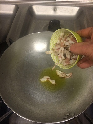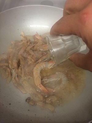 Quando risulterà dorato, abbassare la fiamma, aggiungere i gamberi e sfumare con il brandy e lasciarlo per qualche minuto.