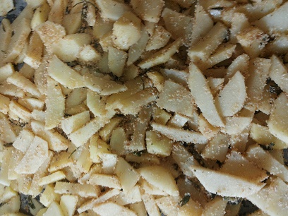 Deporre le patate su carta da forno precedentemente bagnata e strizzata ed cospargere la sabbia in modo uniforme