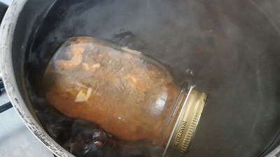 Tappare bene il barattolo e disporlo in una pentola colma di acqua per i 3/4 che precedentemente sarà portato in ebollizione . Abbassare la fiamma quasi al minimo e bollire per 20 minuti.
