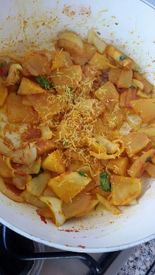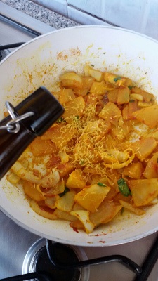 Aggiungere le patate tagliate a listarelle abbastanza piccole da permettere una cottura veloce. Abbassare il fuoco quasi al minimo ed aggiungere prezzemolo, pomodoro, coriandolo, curcuma, miele, limone grattugiato e sale