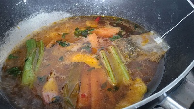Togliere dalla padella l’aglio, il mandarino, la bustina di camomilla e dopo 3 minuti aggiungere il pesce. Far bollire alzando un po’ il fuoco per altri 2 minuti.