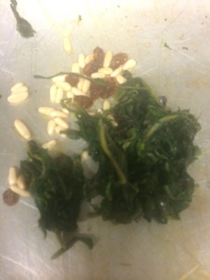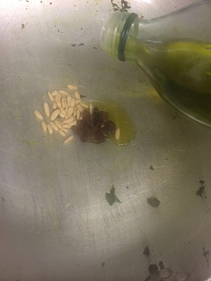 Deporre su una padella olio, pinoli ed uvetta.