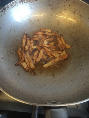 Tagliare in modo sottile le patate e soffriggerle con dell’olio.