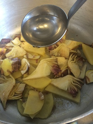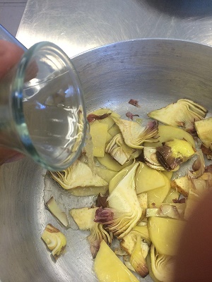 Pulire, tagliare a listarelle il carciofo.