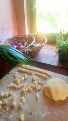 Porzionare il panetto di impasto. Infarinare la spianatoia, tagliare a tocchetti e con l’ aiuto di una forchetta infarinata schiacciare i tocchetti di pasta formando dei “cavatelli’ da tuffarei nella padella.