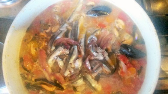 Riaccendere il gas e deporre le cozze dentro la padella, aggiungere le alici pulite senza lische e sfumare con il vino bianco. Dopo circa 5 minuti spegnere il gas.