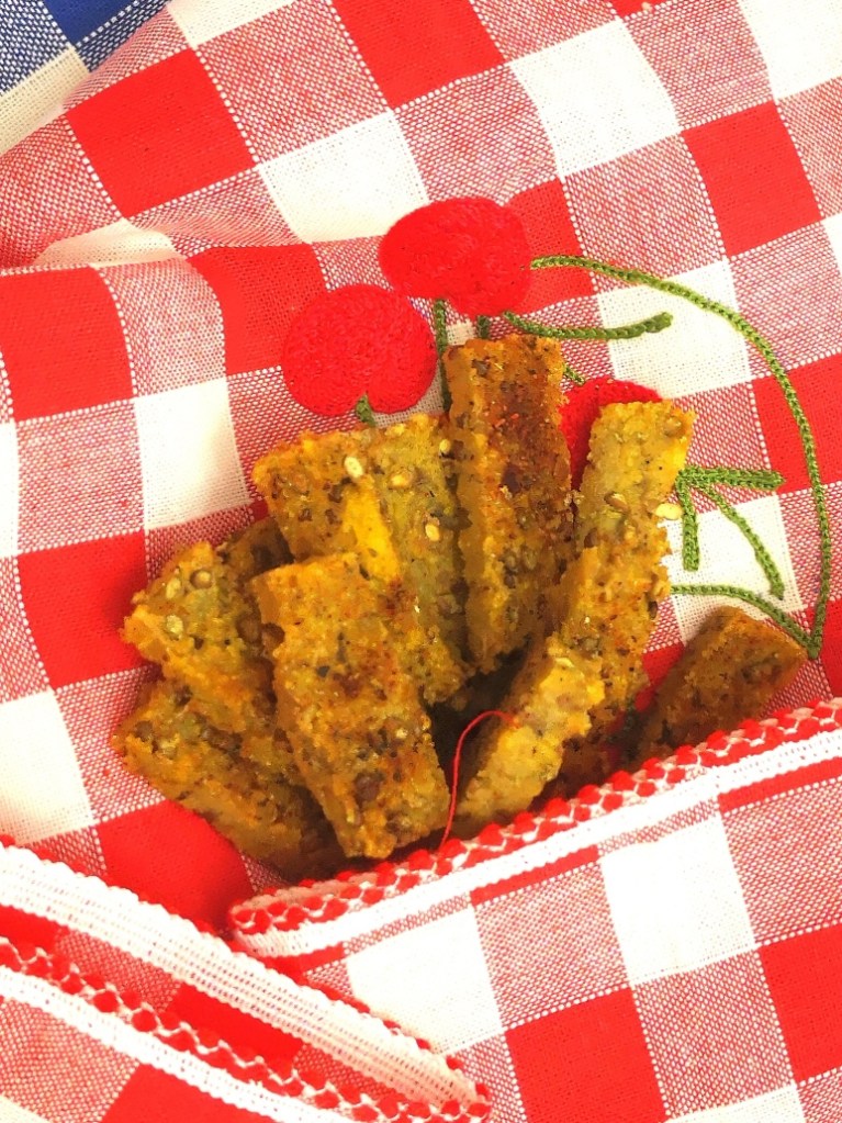 Stendere il composto per raggiungere l’altezza di massimo un centimetro e lasciare raffreddare. Tagliare a strisce sottili per realizzare dei bastoncini sistemandoli su carta da forno, spennellare con olio e spargere il composto di spezie.