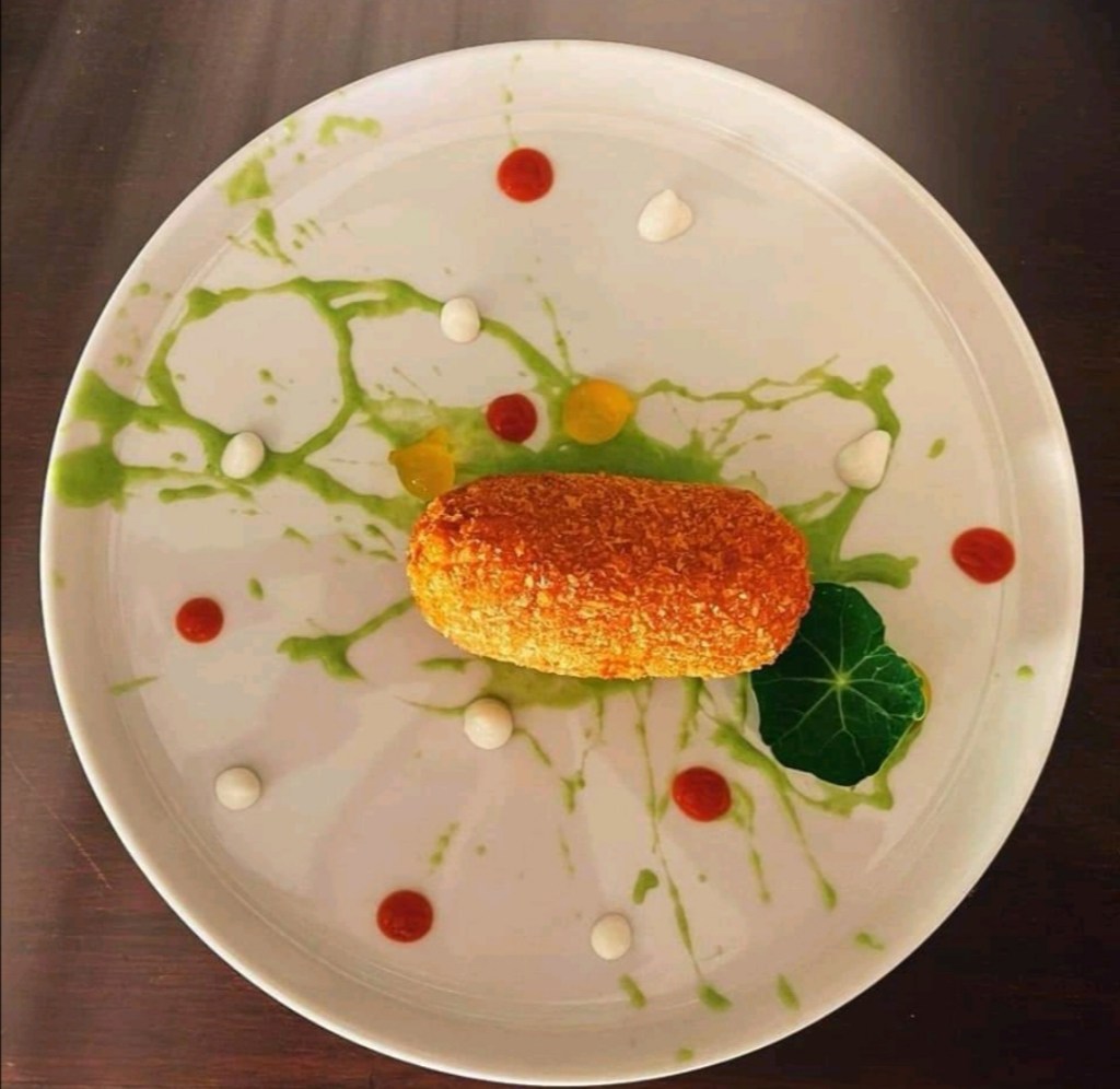 Chef Lorenzo Cantoni: Supplì cacio e pepe rosa, baccalà, zafferano di Cascia e salsiccia di maiale brado di Norcia in salsa di piselli;