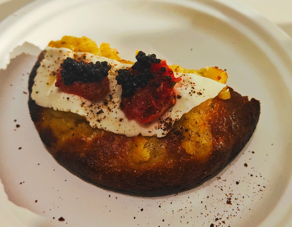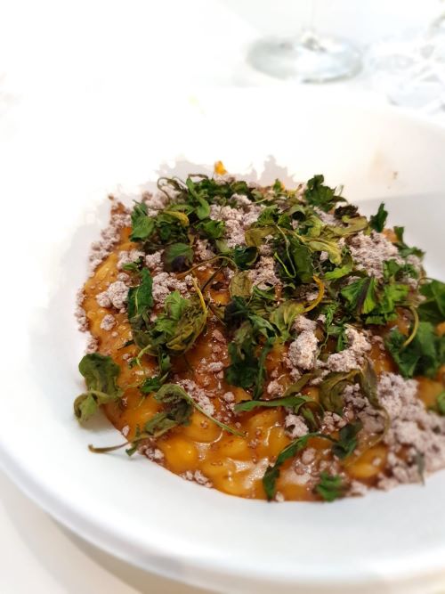 Tra i protagonisti il poliedrico Antonio Gentile, chef di Circus 47, papà giovane di provenienza campana che stupisce con un Risotto alla zucca, cenere di cioccolato ed erbe spontanee. Binomio tra il faraone de Le Tamerici Giuseppe Cappelli, showman d’eccezione che trova il modo di decorare una tavolozza unica creata da un esperto dei carboidrati come Luca Pezzetta tra baccalà, polvere di olive nere, chips di cipolle e origano con pomodori e pinoli. Edoardo Papa, noto per l’eleganza delle sue pizze, sbaraglia con una crema di patate di montagna aromatizzate con finocchietto selvatico e ginepro con una spruzzatina di lime gin, primo sale vaccino, pomodori confit e caviale Royale Select… Ingredienti ben assemblati che in bocca si esaltano vicendevolmente…