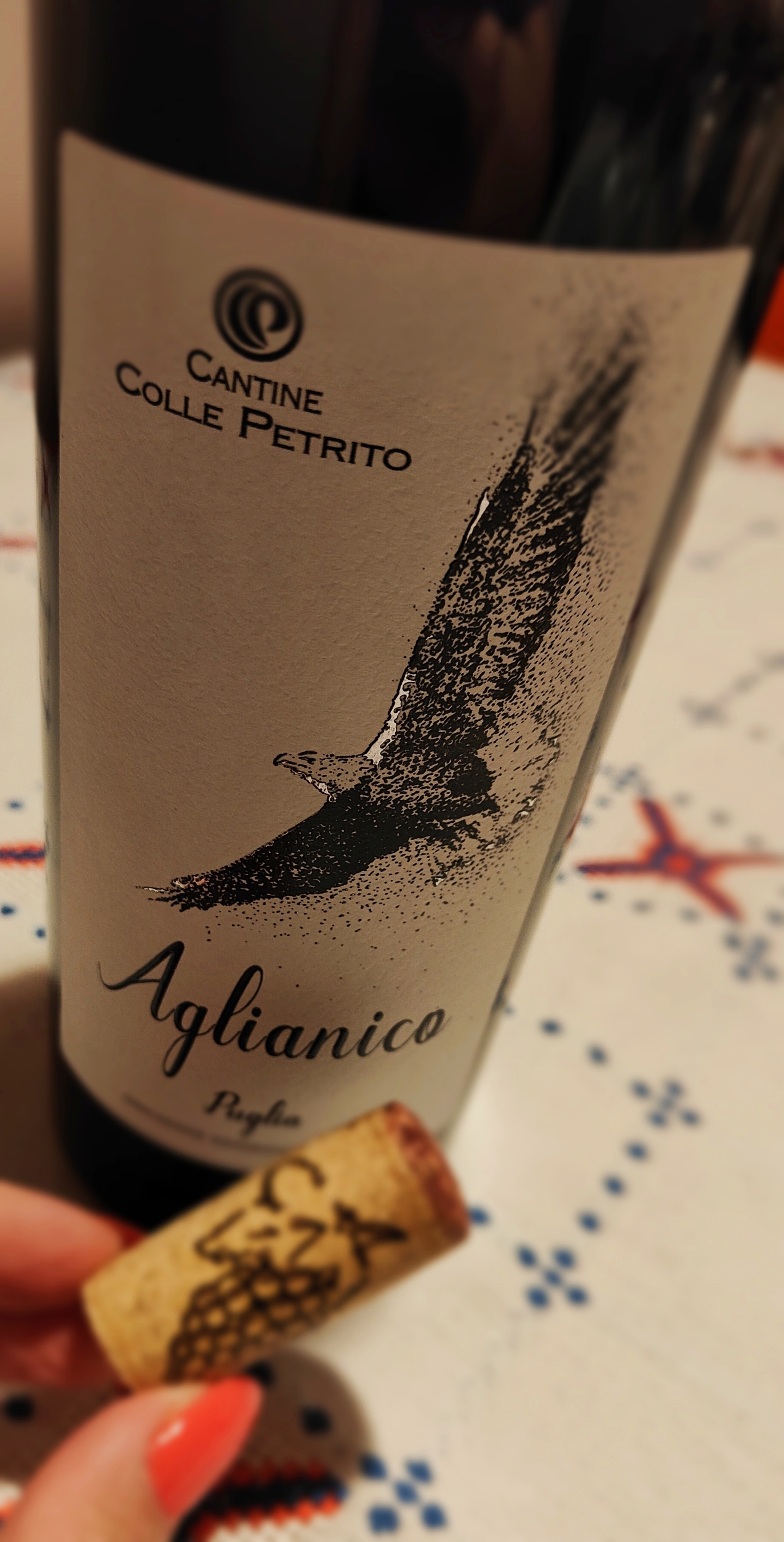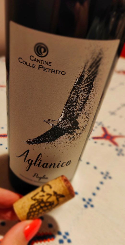 La Falanghina e il Fiano, vitigni a bacca bianca, più noti in Campania, in questa zona sono due accompagnatori distinti per gli aperitivi, primi piatti leggeri, discrete acidità e persistenza. Il Primitivo, un poco rustico, ha un gusto deciso, il Nero di Troia si difende bene, piace e convince. Il podio lo raggiunge l’Aglianico, abbinabilità al cibo, beverino, con un suo personale profilo, un indipendente. L’etichetta la rappresenta: un’aquila che osserva tutto dall’alto.