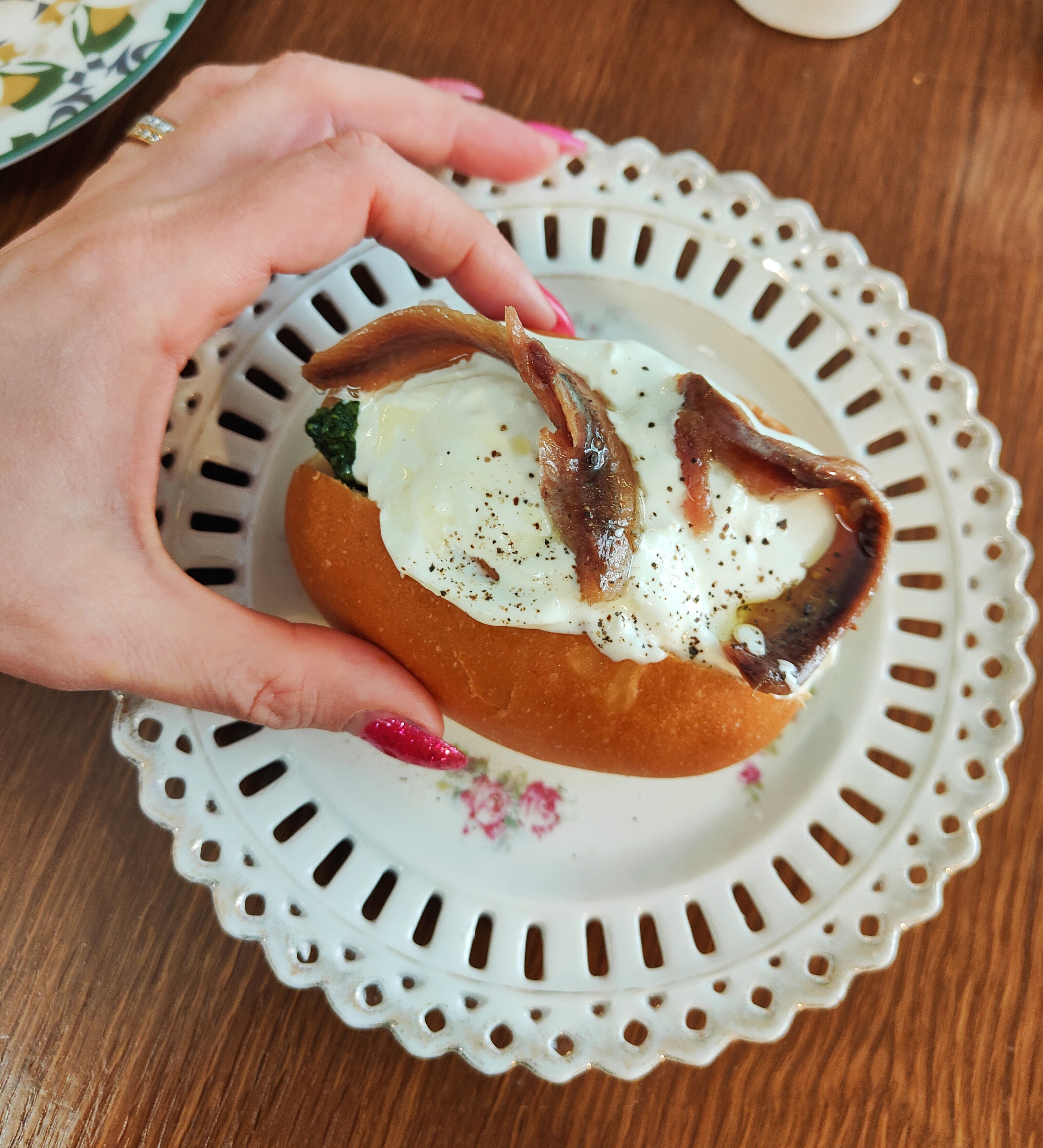 Specchi, luminosità, tavoli confortevoli aspettano un “pubblico” che desidera allontanarsi dalla quotidianità per respirare un’atmosfera serena. È l’anima gentile di Edoardo Fraioli che attrae, la sua discrezione, la sua pacatezza, la sua gentilezza. È la sua leggerezza che si concretizza nel maritozzo salato che è una nuvola di piacere che permette l’apprezzamento di ogni singolo ingrediente.