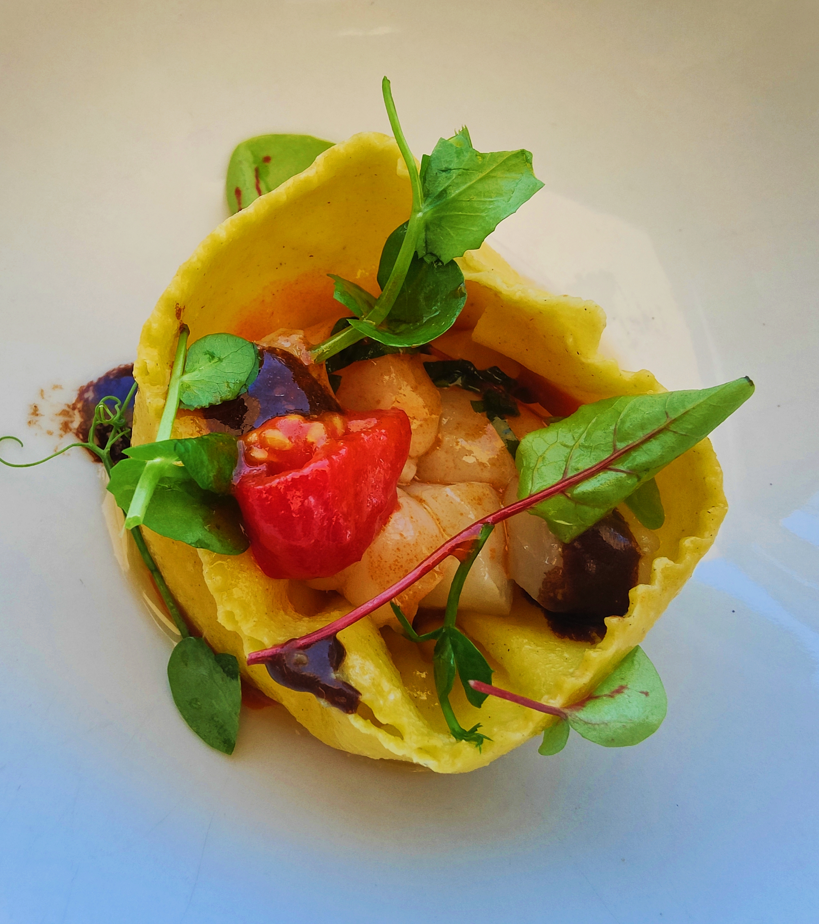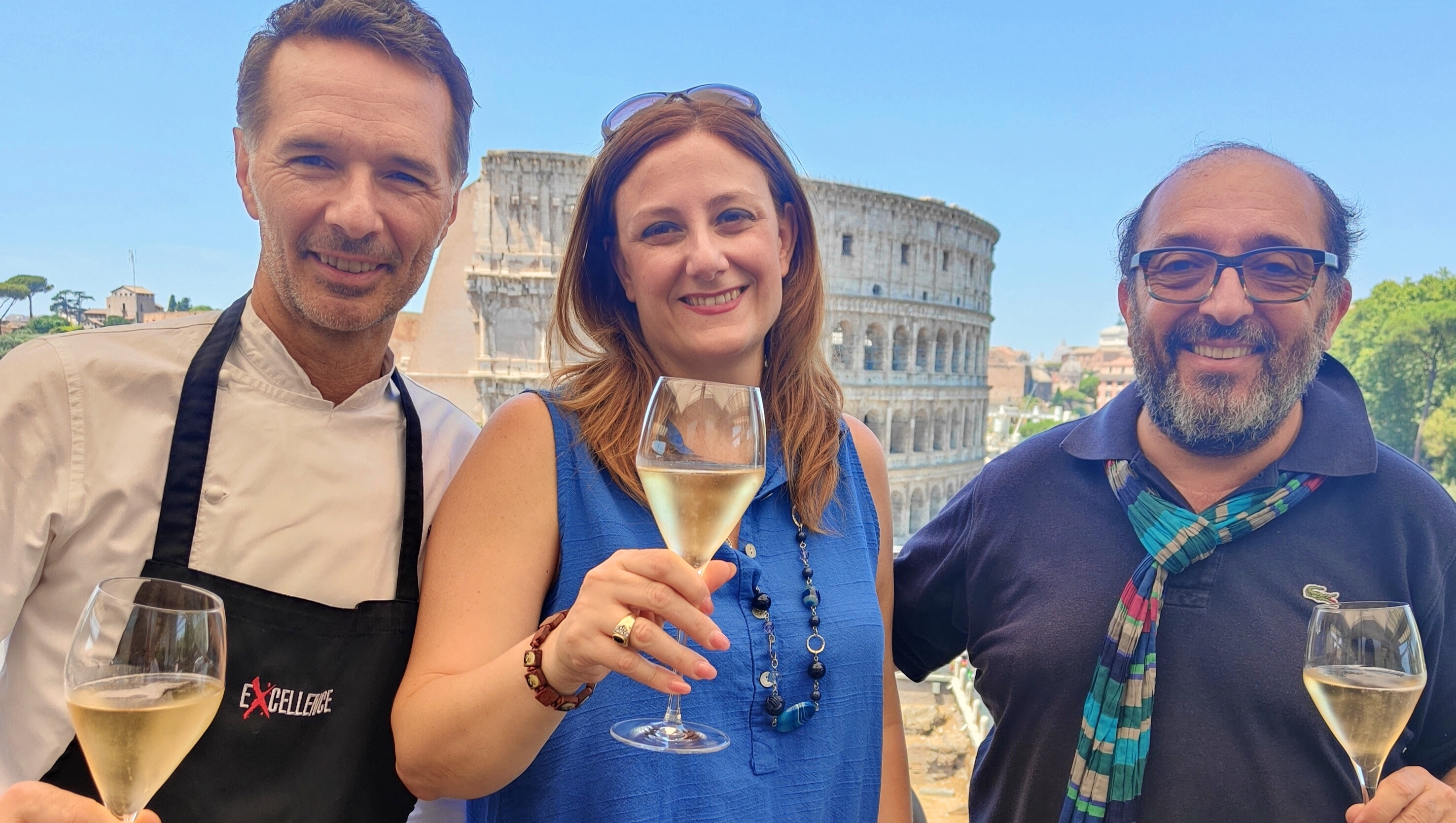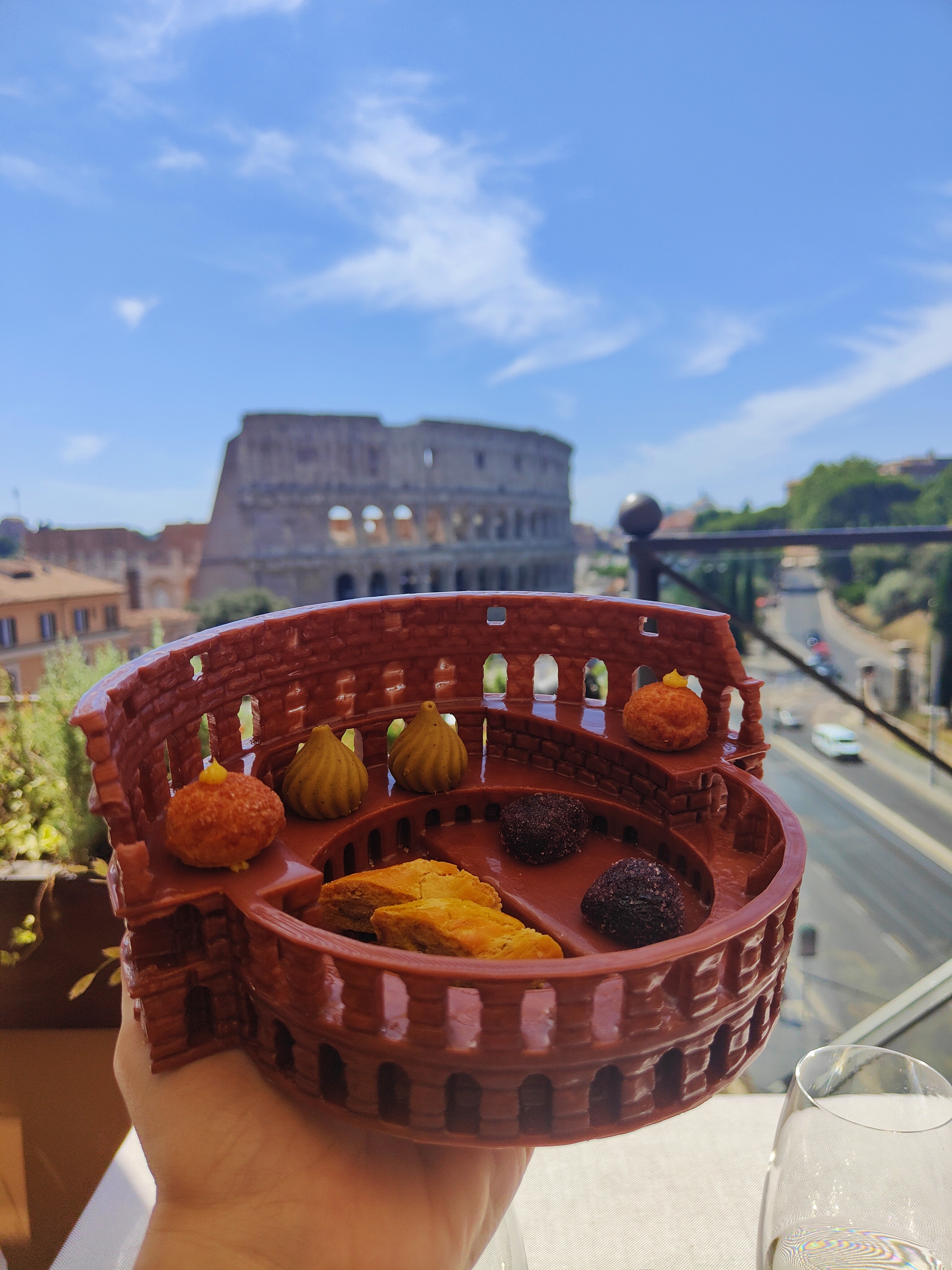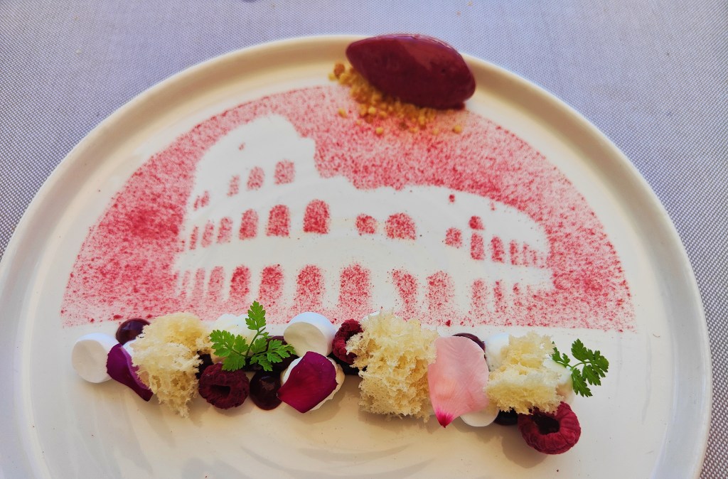 Siamo dinnanzi al Colosseo, per molti meraviglia del mondo, anticamente noto come Amphitheatrum Flavium, desiderato da Vespasiano, inaugurato dal successore e figlio Tito per essere perfezionato dal fratello Domiziano. Destinato agli spettacoli dei gladiatori e alle battaglie navali, resta il simbolo della Città Eterna. Maestoso di giorno, suggestivo di notte. Dinnanzi si erge un edificio seicentesco, noto come palazzo Manfredi sebbene in origine fosse della famiglia Evangelisti. Attualmente ospita un hotel la cui terrazza, dall’incantevole vista, è celebre per l’abilità di Giuseppe Di Iorio, executive chef di Aroma, che conquista la stella Michelin nel 2014 per poi riconfermarla. Non si tratta di uno stile antico, ma di un approccio chic al pubblico che si manifesta attraverso la professionalità dei dipendenti, l’accoglienza del luogo, la perfezione del Di Iorio … Sì, perché Di Iorio è perfetto tanto da far impallidire i suoi conosciuti colleghi. Ha la capacità di trasformarsi in pittore per la creazione di tavolozze edibili, un peccato mangiarle); scultore, perché le pietanze si guardano, si annusano, si toccano; musicista perché si entra in un’altra dimensione, sembra di toccare il cielo con un dito e di ascoltare il coro celeste descritto nel Paradiso dantesco. Gli ingredienti mantengono gusto e colore, in bocca si trasformano in un’esplosione di piacere. Tutte le consistenze si uniscono in modo equilibrato e appagante. Un piacere infinito come pochi. Il pane è fragrante, i profumi delicatamente veraci, i sapori nitidi. La fantasia prende forma tanto da rappresentare il Colosseo prima con la tecnica del “puntinismo”, per poi ritrovarlo come contenitore di dessert speciali dall’incantevole scioglievolezza. Nessun cassetto della memoria, nessun ricordo della nonna. Si tratta di una carezza nuova, diversa, vellutata, affascinante, destinata a pochi eletti. Al di là della piacevolezza dei piatti, qui si va oltre. Giuseppe non possiede solo eleganza nella loro composizione e nella scelta degli ingredienti, ma anche nei gesti, negli sguardi, nelle parole. Tratta con rispetto i collaboratori, sta dietro i fornelli occupando qualsiasi ruolo e soprattutto incarna i valori della discrezione e dell’ospitalità … Forse ricevuti dalla madre, proveniente dalla Magna Graecia. Generoso nei giudizi verso i colleghi, attorniato da volti conosciuti non se ne vanta, perché Giuseppe Di Iorio non appare … È!