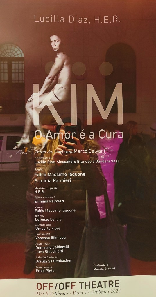 Nella deliziosa e accogliente cornice dell’ Off Off Theatre della Capitale fino al 12 febbraio è possibile godere dello spettacolo Kim O Amor è a Cura tratto da Unghie di Marco Calvani, diretto da Fabio Massimo Iaquone e Erminia Palmieri con Lucilla Diaz e la partecipazione straordinaria, di nome e di fatto, della violinista H.E.R.