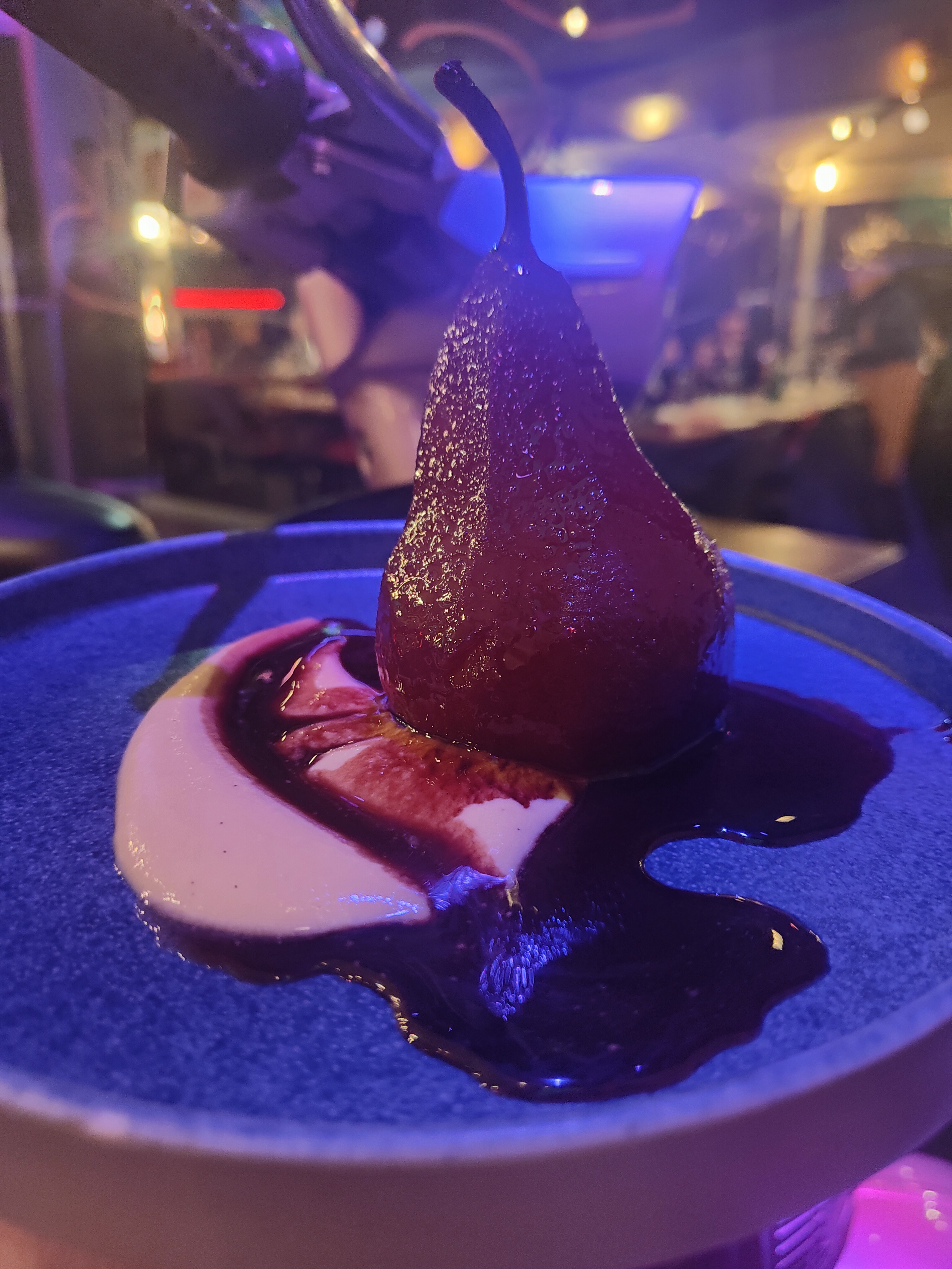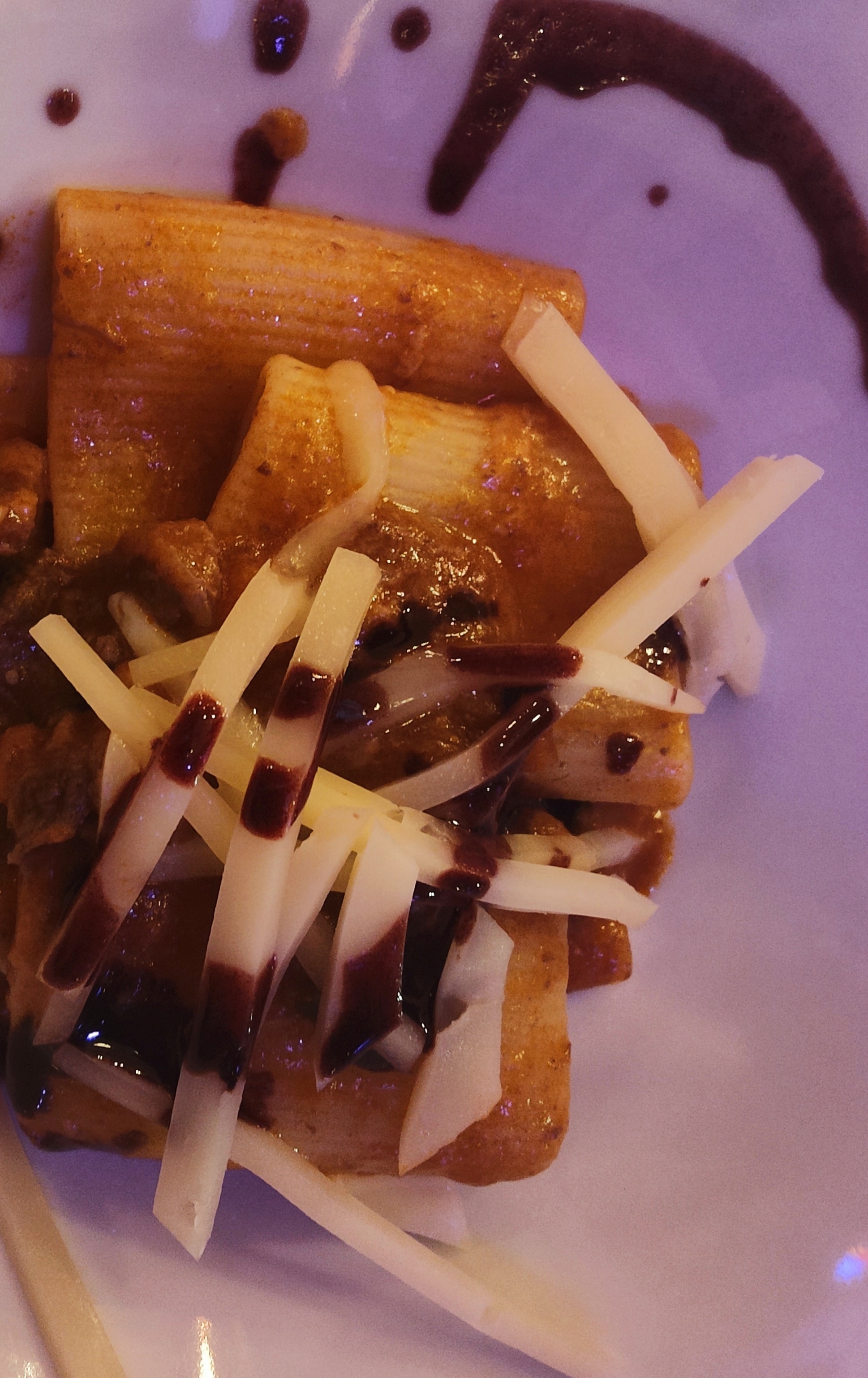 Ciccetto di polenta grigliata con alici in soar seduce il Conte Federico Riserva Brut (Pinot Noir e Chardonnay) in versione magnum. Bollicine dai perlage fine e persistente stuzzicano narici e appetito. Il sorso sposa perfettamente anche il Carpaccio di manzo “Sakura Yoza” con coulis di mango, pesto di rucola e mandorle. Il piatto è una tavolozza di colori creativa e saporita. Carnoso il morso del Foie gras, cipolla rossa in agrodolce, aceto balsamico extra vecchio e crostino di pan focaccia; ancora goloso l’Arancino al Valpolicella al gorgonzola che si lascia tentare dall’ IGT Brolo Campofiorin Rosso Verona 2018 (magnum) Corvina, Rondinella, Molinara con l’aggiunta di Oseleta dal grappolo compatto, cilindrico che regala uno schizzo tannico maggiore. Di ottima qualità il Pacchero Flaminio con ragù di cinghiale, riduzione di Valpolicella e formaggio “Bastardo” del Grappa che si accoppia a Toar Valpolicella Classico Superiore Doc 2019 (Corvina, Rondinella, Oseleta) dal finale persistente degno dei suoli vulcanici dai quali è generato. Il Filetto di manzo all’Amarone Masi con purè di topinuambur è esaltato da Costasera Riserva Amarone della Valpolicella DOCG 2017 (Corvina, Molinara, Rondinella) sempre in formato magnum. Il sorso è generoso intrigante. Pepe nero, chiodi di garofano, amarena su un tappeto di mirtilli e rabarbaro. Le pere cotte nel vino rosso con crema inglese si abbinano alla sfaccettata Grappa di Mezzanella, prodotta con le vinacce delle uve appassite utilizzate per il Recioto. Bottiglia simpatica e versatile dal contenuto prezioso.