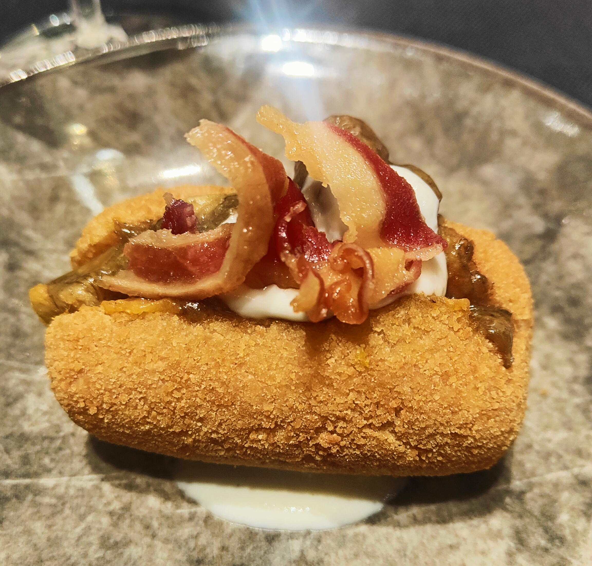 Le Crocché di patate dolci con funghi porcini, pancetta coppata croccante e provola dolce si accoppiano ad Anna (Pecorino 100%) Metodo Classico, maturazione e affinamento di 48 mesi sui lieviti, dalle nuance preziose, il perlage fine e persistente nel quale la mineralità regna. Crosta di pane poi si trasforma in burro fuso, susina gialla, melone, felce, citronella regalano un assaggio elegante, compagno versatile di abbinamenti intriganti, un asso vincente che, in bocca, si trasforma in un’onda sapida e fresca degna di un surfista alla ricerca di emozioni.