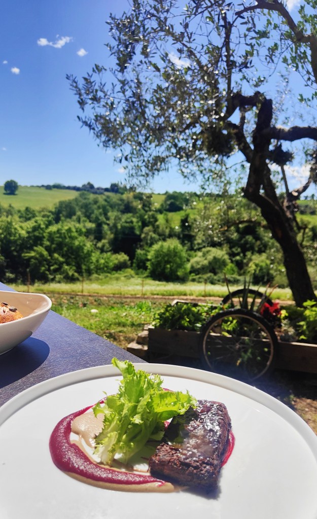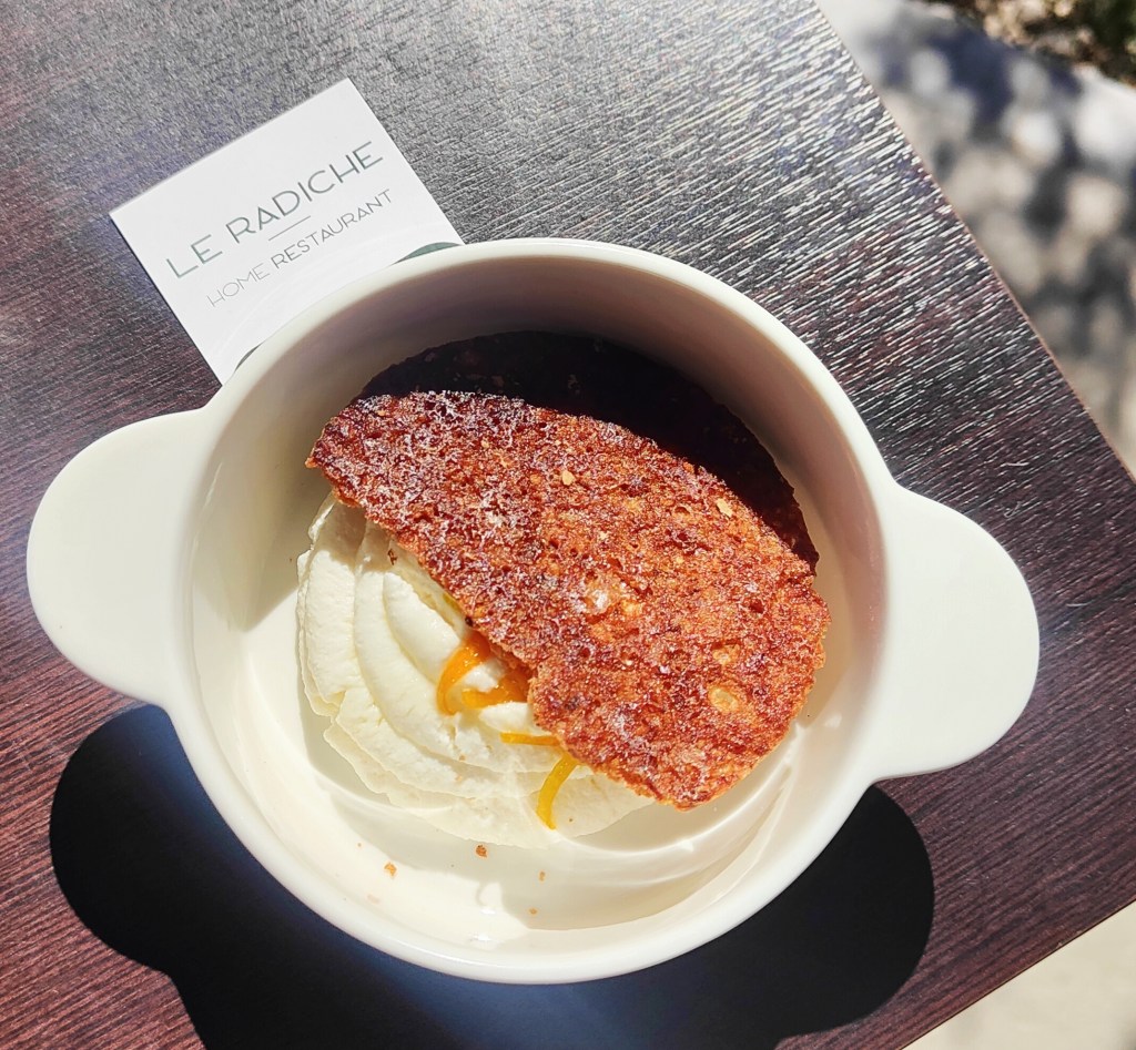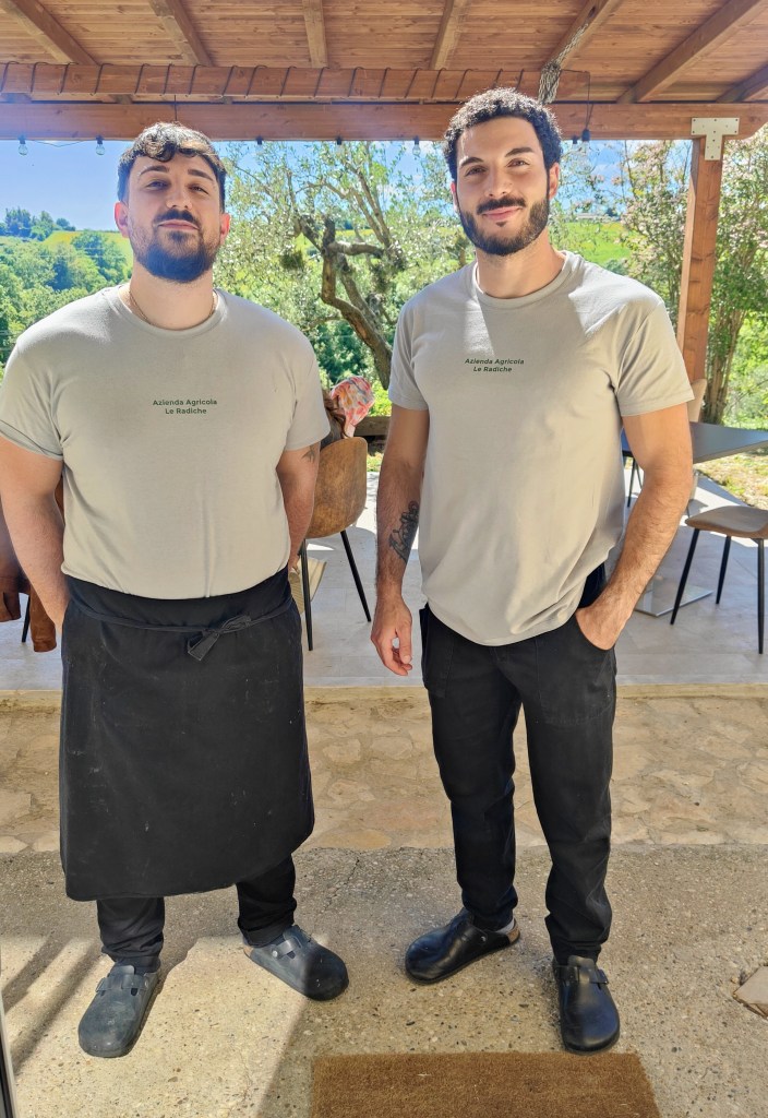Numerose le genti che hanno deciso di abbondonare la cittadina per trasferirsi nella Capitale o lasciare definitivamente il lungo Stivale. Alcuni giovani, però, stabiliscono di restare lì, dedicandosi al lavoro della terra per diventare piccoli imprenditori, contando sulle proprie forze e risorse, tra questi il talentuoso Paolo Frollani che, assieme al braccio destro Andrea Feurra, crea un piccolo paradiso terrestre più noto come Le radiche home restaurant proprio al confine tra la Città eterna e il “sacro paese”. Deliziose pietanze servite dinnanzi un panorama che lascia sognare nel quale si respira la terra, si ascoltano gli animali, si è baciati dal sole e coccolati da un’ospitalità tutta italiana. Gli ingredienti provengono dall’orto e durante il weekend, con prenotazione, è possibile guardare, annusare e assaporare un menu di stagione. I colori della natura si trasformano in nuance variopinte che Paolo, coadiuvato da Andrea, tramuta in schizzi edibili dalle disparate consistenze. Piccoli e allettanti piaceri conducono verso il girone dei golosi. Accostamenti non sempre scontati testimoniano una personalità determinata e generosa, dalla fervida immaginazione. Chips di tapioca, cinghiale e pere sono irresistibili; sinuosa la Lasagnetta di anatra, porro e mais; audace la Terrina di pecora, noci rapa e indivia; un ritorno all’infanzia in versione sprint il dessert Arancia, nocciola e mentuccia.