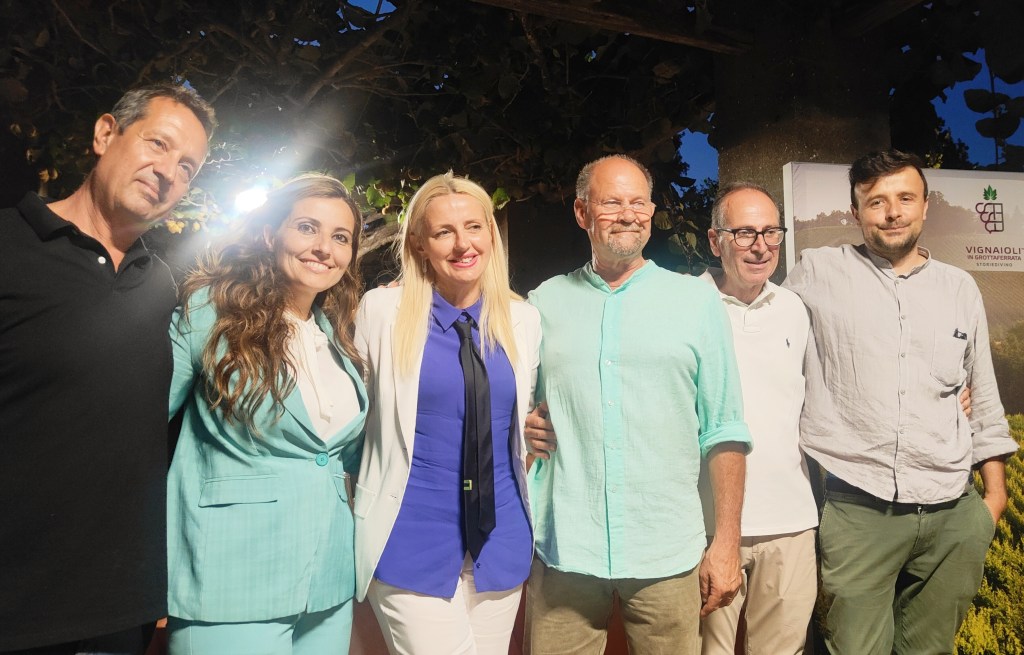 Grottaferrata, deliziosa cittadina a pochi chilometri della Capitale, luogo di villeggiatura dal clima mite, vasto territorio dei Castelli Romani, il nome deriverebbe da Cryptaferrata, il cui suolo vulcanico è caratterizzato da un’interessante varietà minerale, è nota soprattutto per la sua Abbazia fondata nel 1004 da San Nilo da Rossano, sede dell’Ordine basiliano italiano. Il suo stile varia dal romanico con echi bizantini al barocco, l’interno è impreziosito tela Madonna con Bambino tra i santi Nilo e Bartolomeo attribuita al Carracci. Generosa e preziosa la biblioteca visitabile, al lato della struttura. In questi luoghi storici, mistici e preziosi nasce l’Associazione di Grottaferrata presieduta dalla giovane e intraprendente imprenditrice Tiziana Torelli che, proprio con l’arrivo dell’estate, ha presentato il progetto “Crypta”. Un marchio che lega un nettare al territorio attraverso la scelta autonoma delle uve che ormai rappresentano una realtà ben consolidata ma che rammenta che un vero Crypta abbia la coltivazione, la vinificazione e l’imbottigliamento rigorosamente a Grottaferrata secondo un regolamento condiviso e in corso di certificazione terza. Una concezione ambiziosa che unisce sacro e profano. Un torchio mistico nel quale il sacrificio di Gesù si trasforma in vino per uomini eletti che non sono semplici avventori ma destinatari di un messaggio. Tra gli ospiti d’eccezione il climatologo premio Nobel per la Pace Nigel Tapper, il Maestro Beppe Vessicchio e la volitiva e bella signora del vino Dominga Cotarella testimone del concetto di team adottato anche da Tiziana.