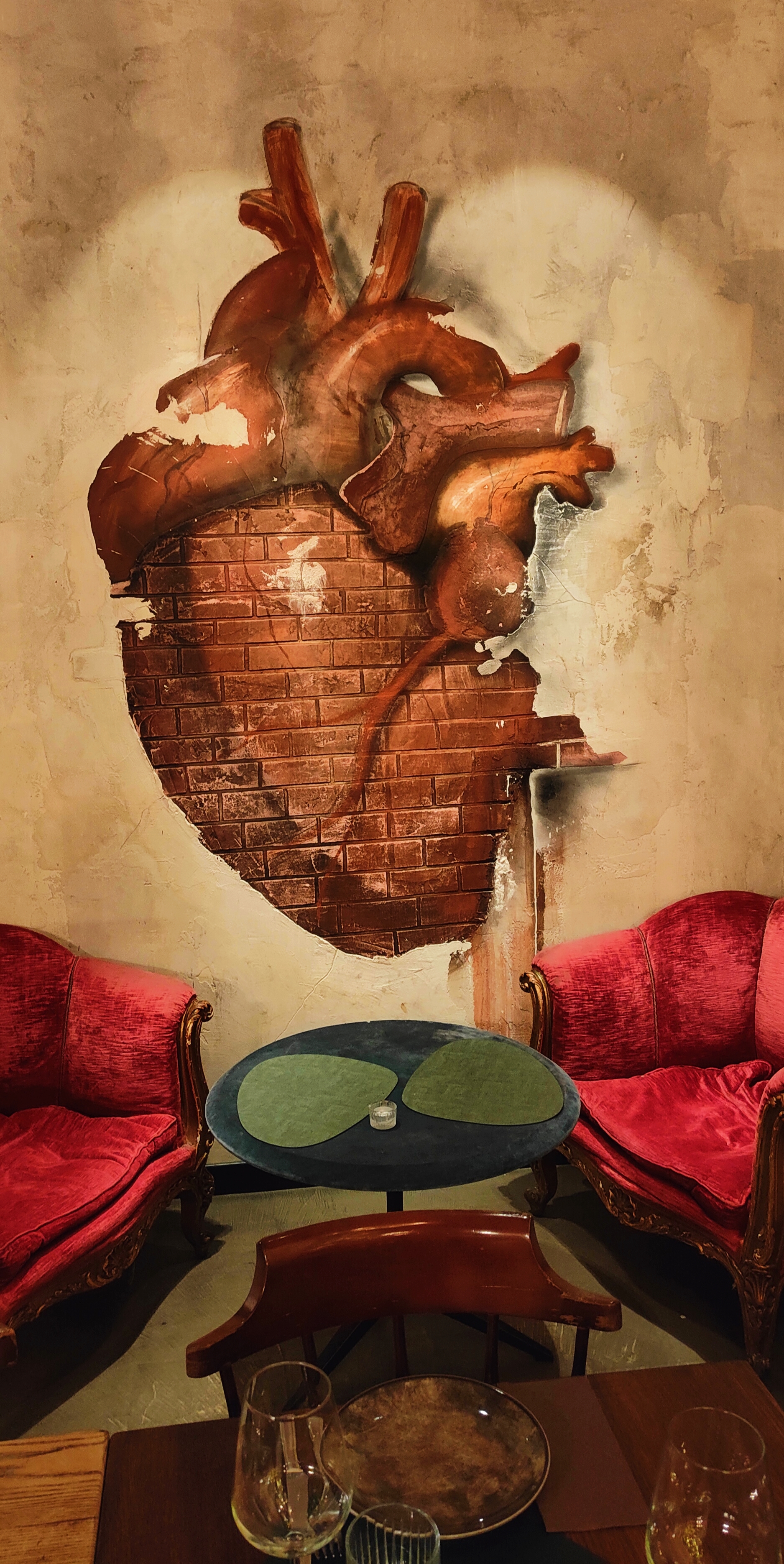 Location suggestiva che regala un’altra dimensione disegnata dal fortunato avventore. Un cuore sulla parete dalle differenti interpretazioni. Frasi secche che invitano al sorso, divanetti comodi e poi accoglienza e calore umano palpabili non solo per lo spirito ma anche per naso e palato. La list drink cambia ogni sei mesi ed è esaltata da una cucina raffinata e gustosa. La materia prima è al centro dell’attenzione. La tradizione romana si assaggia nella sua interezza. L’abilità di Luca consiste nel regalare in un solo morso la piacevolezza dei singoli ingredienti rendendoli riconoscibili sebbene ben amalgamati. Giorgio realizza cocktail beverini, avvolgenti che inducono a essere tutti sorseggiati.