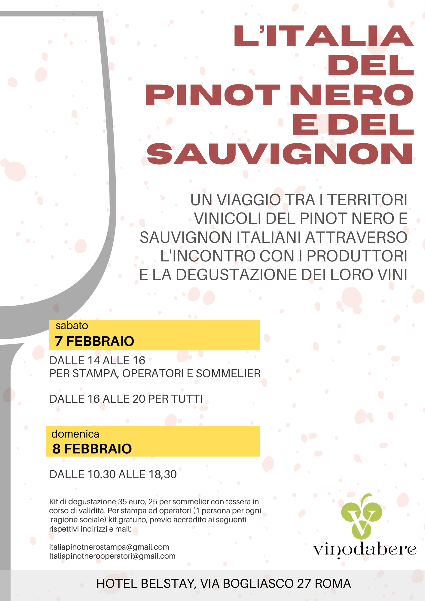 Tutte le altre informazioni sono disponibili qui: https://vinodabere.it/litalia-del-pinot-nero-e-del-sauvignon-levento-organizzato-da-vinodabere-sabato-7-e-domenica-8-febbraio-2026-a-roma-presso-lhotel-belstay/