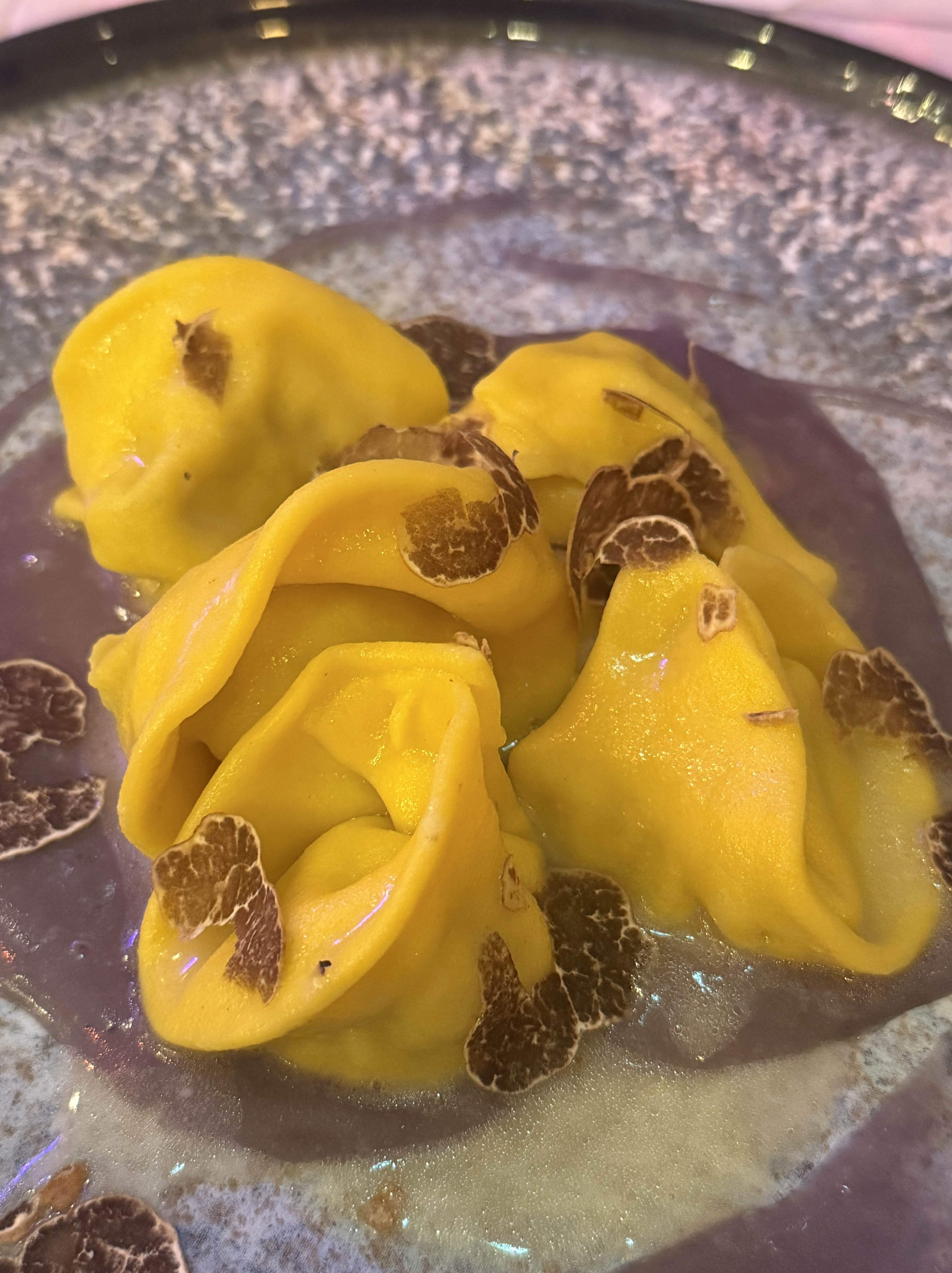 Il passo successivo è affidato ai Ravioli ripieni al tartufo con vellutata di patate viola, esaltati dal Brunello di Montalcino DOCG 2021, che al naso rivela note di pepe, tabacco biondo e viola mammola, mentre in bocca sviluppa una progressione lunga e coerente.
